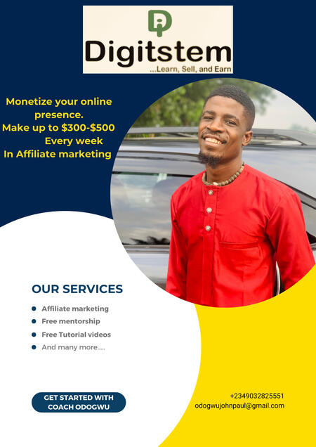 What's Digitstem ?Digistem Affiliate Marketing is a platform that pays it's Affiliate in dollars meaning when you sign up as an affiliate you'll be positioned to promote digital products and easily get paid your commission in DOLLARSNOTE: You will be paid to your Local. account when you request for Withdrawal.Digitstem is one of the platform for affiliate marketing in Nigeria.So what happens is once you register as an Affiliate on digitstem, you have access to market any product and earn a commission. These products are digital products.Let say for instance you decided to promote a product and sell and the amount of the product is 50k with a 50% commission.That means when you sell one of that product, you'd earn 25k.Now let's imagine you sell 5 of that product in a week, which is very possible,you earn 125k that week because digitstem pays every Saturday.💰One thing I love about digitstem is when you register as an Affiliate, they give you access to their course that will put you through everything you need to know.Do amazingly well as an affiliate and you'd also be having exclusive access to my mentorship which will shorten the learning curve.This system of making money online selling other people’s products is called AFFILIATE MARKETING.